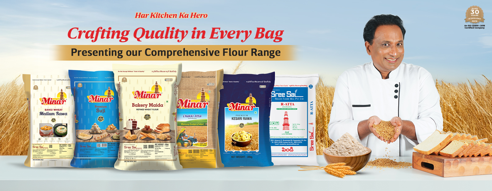 Sree Sai Roller Flour Mill Private Limited (Group) was founded by Mr. Ram Prakash Bansal in the year 1996 and has earned itself the reputation of the largest manufacturer and supplier of Premium Wheat Products in the state. Being on top of its helm for its consistency in quality assurance, we are positioned at the top in the Flour Milling Industry in Telangana & Andhra Pradesh and are well recognized by the name ‘MINAR. Mr. Bansal’s over 40 years of experience in the industry has earned him and his ventures unquestionable goodwill right from its inception. The ISU 22000:2018 HACCP Certification quantifies our commitment to excellence.